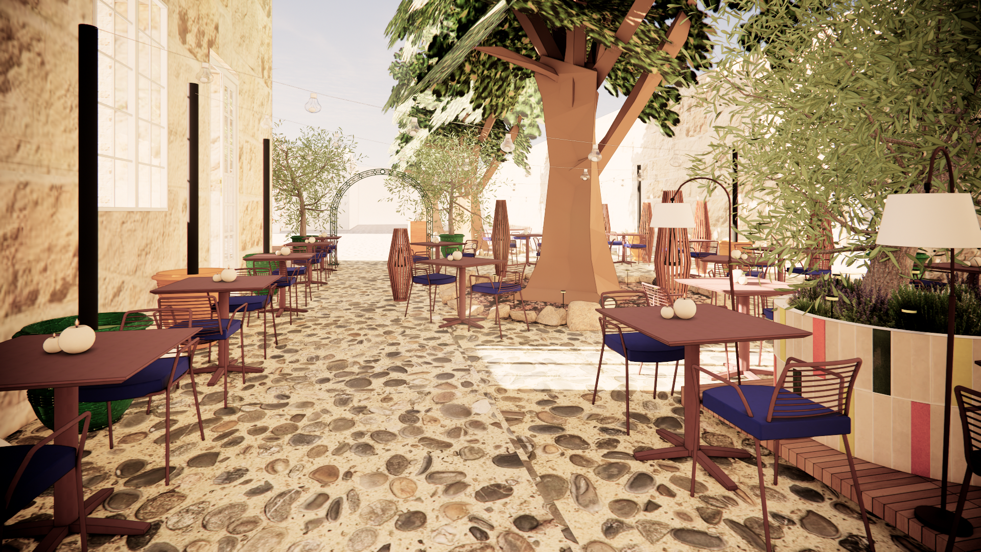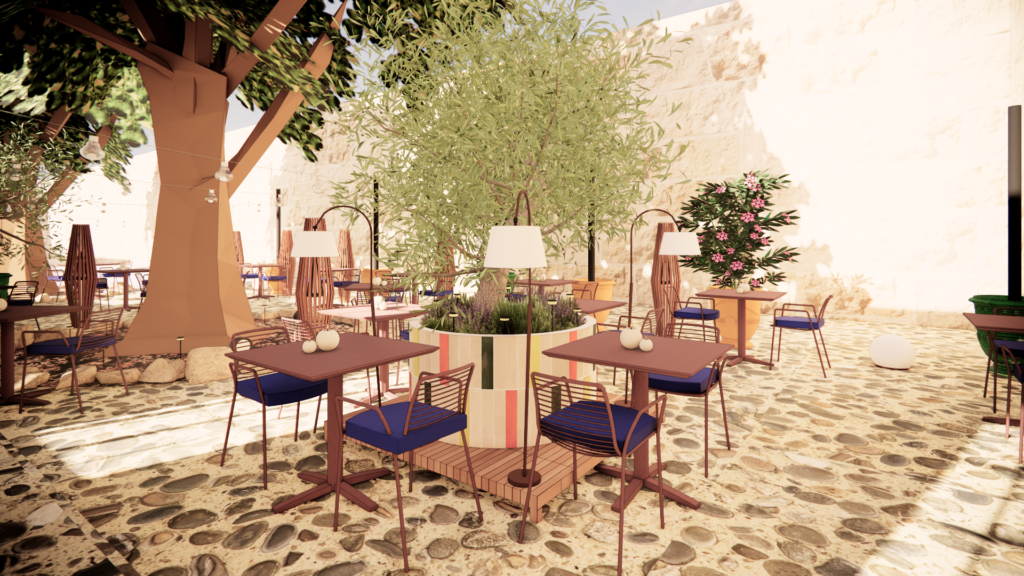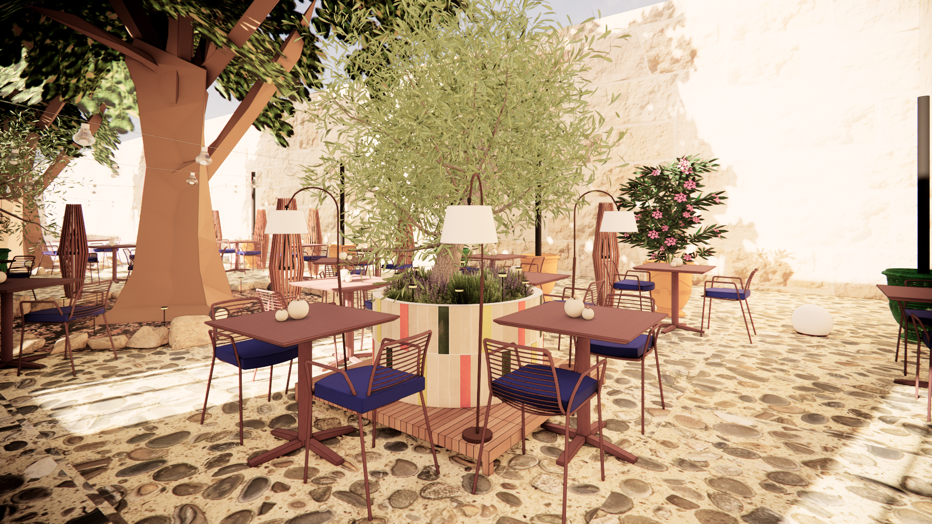 Inspiré des extérieurs des restaurants gastronomiques d’Italie, j’ai appréhendé la terrasse comme une “place” italienne, en référence aux différentes places de Rome. J’ai voulu imaginer un système pour créer comme une “place centrale” sur la terrasse. D’une part, pour apporter des éclairages discrets au centre de l’espace, d’autre part pour créer une circulation entre les tables et enfin pour créer un élément déco remarquable.